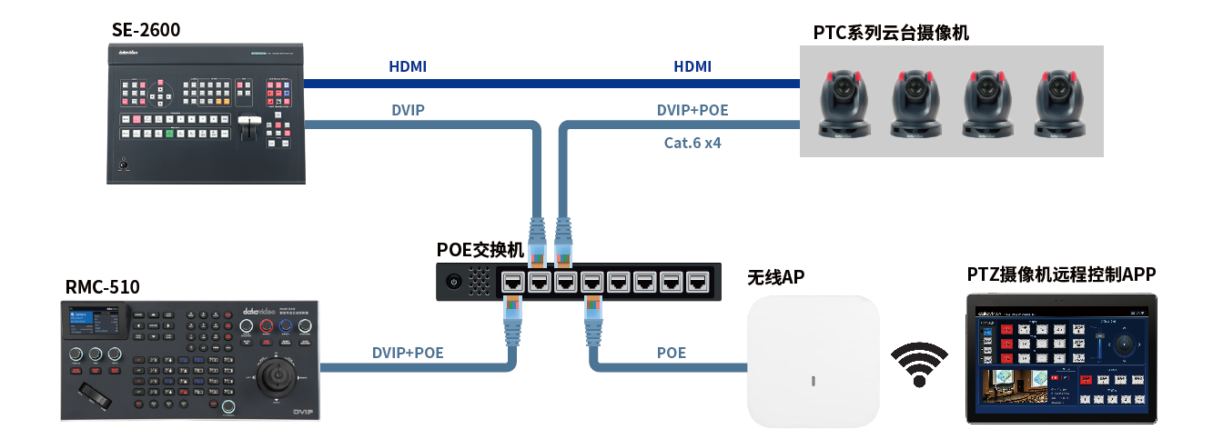 - Datavideo专有协议为PTC系列摄像机、RMC-510智能专业云台控制器、PTZ 摄像机远程控制APP及SE-2600构建全域控制网络。无论通过RMC-510硬件面板的直观操控还是通过手机/平板的PTZ 摄像机远程控制APP远程控制摄像机,亦或是通过SE-2600进行远程多机位画面切换、特效及字幕叠加等,DVIP都保障了多终端、无冲突的协同控制体验。