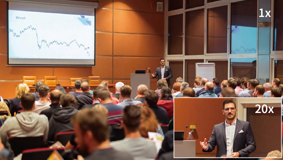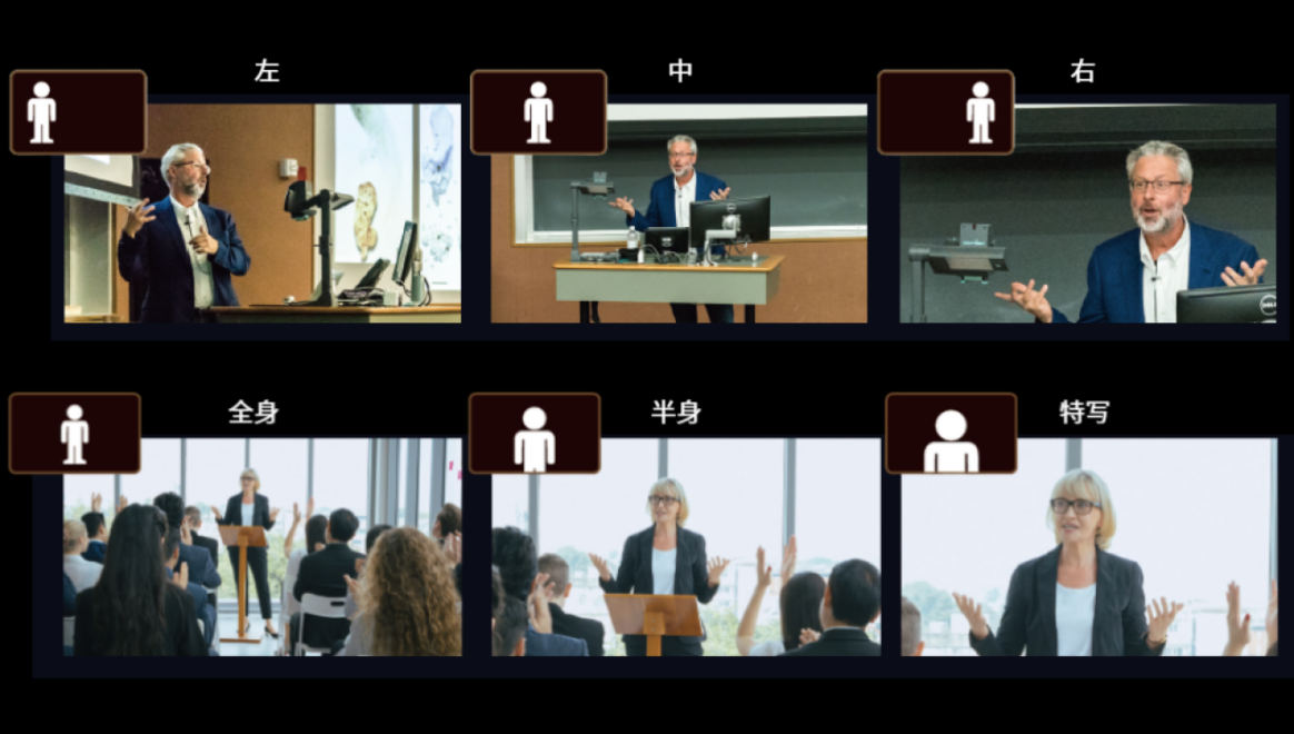 单人演讲或培训场景:一台PTC-305负责拍摄报告厅全景、舞台近景等丰富构图,另一台PTC-305则始终保持智能构图追踪演讲人,确保主讲人始终处于画面焦点。