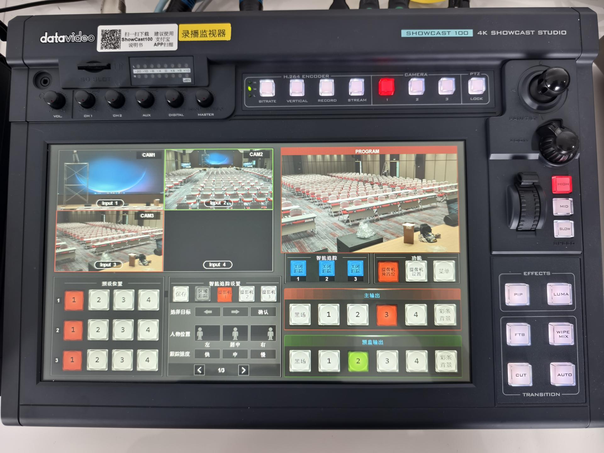 报告厅核心的SHOWCAST 100 4K可视化触控一体机如同系统的大脑,集导播、录制、直播、控制于一身,其14英寸大型触控屏幕简化了操作流程,像操作平板电脑一样直观便捷,即使非专业导播人员也能轻松上手。搭配两台20倍光学变焦的PTC-305 4K 智能追踪云台摄像机和一台宽视角的PTC-285 4K智能追踪云台摄像机,构成了灵活多变的全场景采集网络。