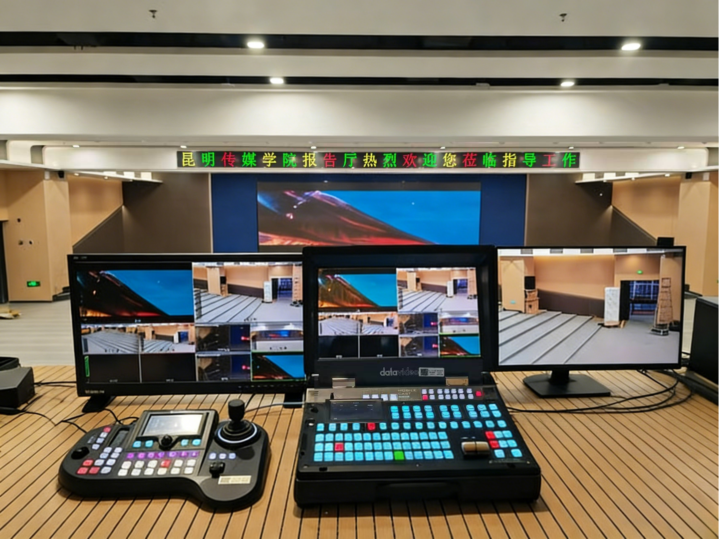 云南昆明传媒学院新建报告厅致力于打造一个集学术会议、课程录制、大型活动直播于一体的多功能现代化视听平台。系统以4K超高清制作为核心,采用洋铭(Datavideo) 全系列设备构建了一套高效、稳定且易于操作的视音频系统,显著提升了学术活动的传播效率与资源共享能力。