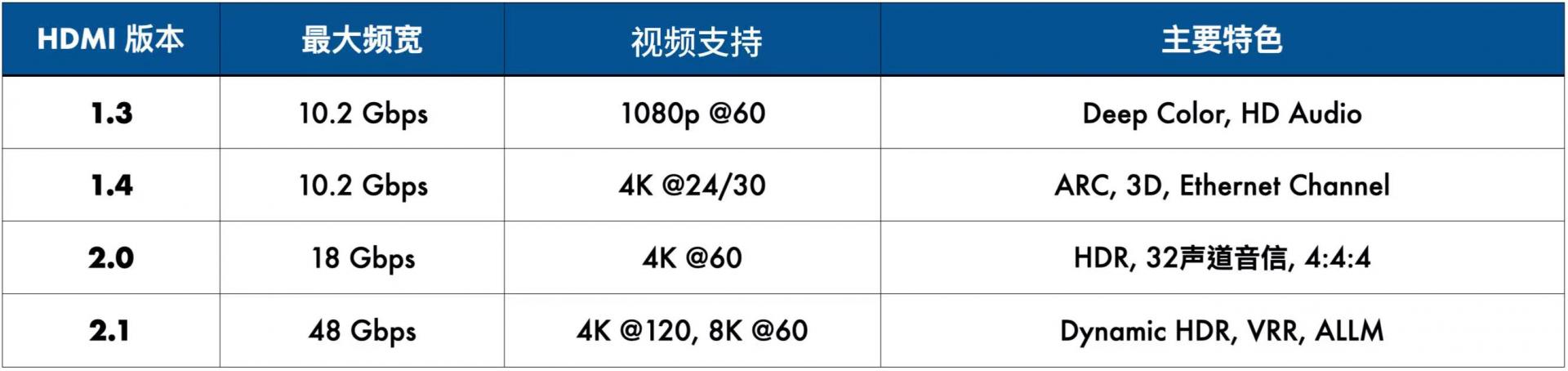 HDMI 自 2002 年完成规格制定并于 2003 年正式发表以来,持续在带宽、分辨率、影像格式与功能上不断进化。从早期的 Full HD,到现今主流的 4K,甚至迈向 8K,高分辨率、宽色域与高帧率的需求,皆推动了 HDMI 规格的演进。以下整理 HDMI 1.3、1.4、2.0 到 2.1 的主要特色与差异,协助快速掌握各世代 HDMI 的技术能力。
