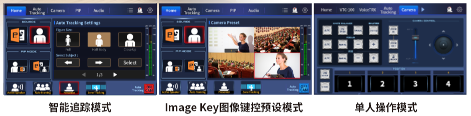 三种模式切换:智能追踪模式(联动摄像机)、图像键控预设模式(快速调用预设机位画面)、单人操作模式(手动控制摄像机PTZ功能),应对不同演示需求。