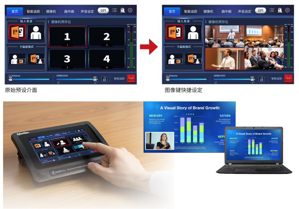灵活画面组合输出:洋铭AUTOCAST mini支持灵活画面组合输出,适配多场景内容制作需求,功能实用且操作便捷:系统搭载Image Key(实时构图存储键)功能,截取摄像机当前画面生成可视化快捷键,替代文字按键,轻点即可无缝切换至预设机位与景别,实现“所见即所得”;同时可无缝切换摄像机与PPT等多媒体信号,搭配灵活画中画功能——自定义窗口位置与大小,演示课件时能同步呈现主讲人,让画面更丰富立体。