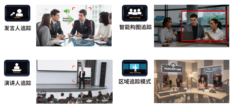 多模式适配:支持发言人追踪(智能检测活跃发言者的声音方向切换摄像焦点)、智能构图追踪(智能识别场景人数调整画面构图)、演讲人追踪(精准持续追踪指定人员)、区域追踪(摄像机根据自定义区域触发或限制追踪),满足不同应用场景需求。