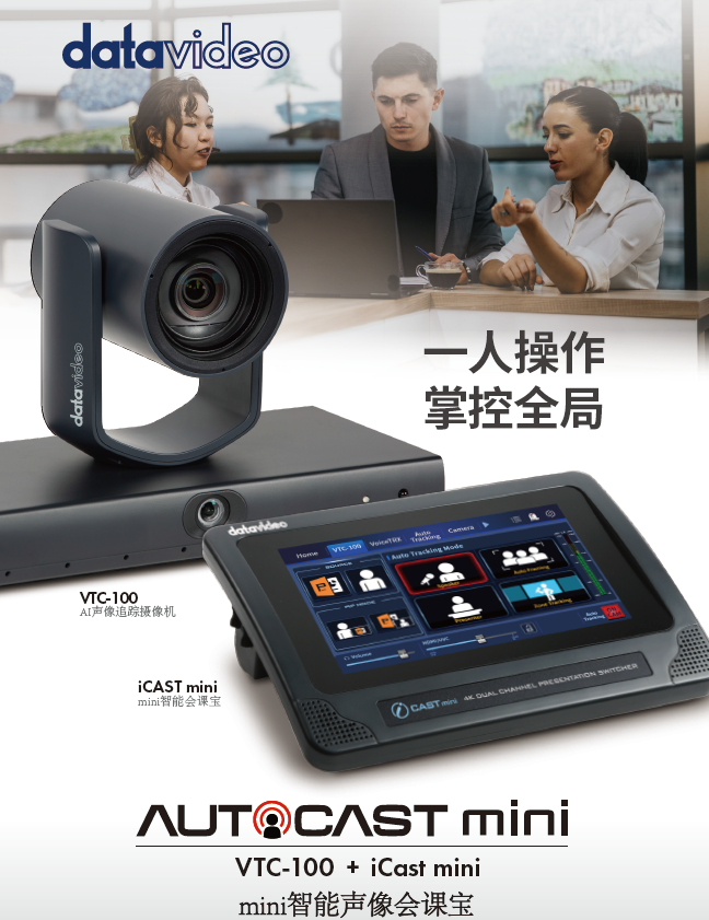 做混合式会议、线上培训或直播时,你是否常因独自操作设备手忙脚乱?Datavideo 全新 AUTOCAST mini 轻量化解决方案来了!它由 VTC-100 AI声像追踪摄像机与iCAST mini 智能会课宝组成,专为单人场景设计,无需专业技术,一人就能打造高质量直播与演示。